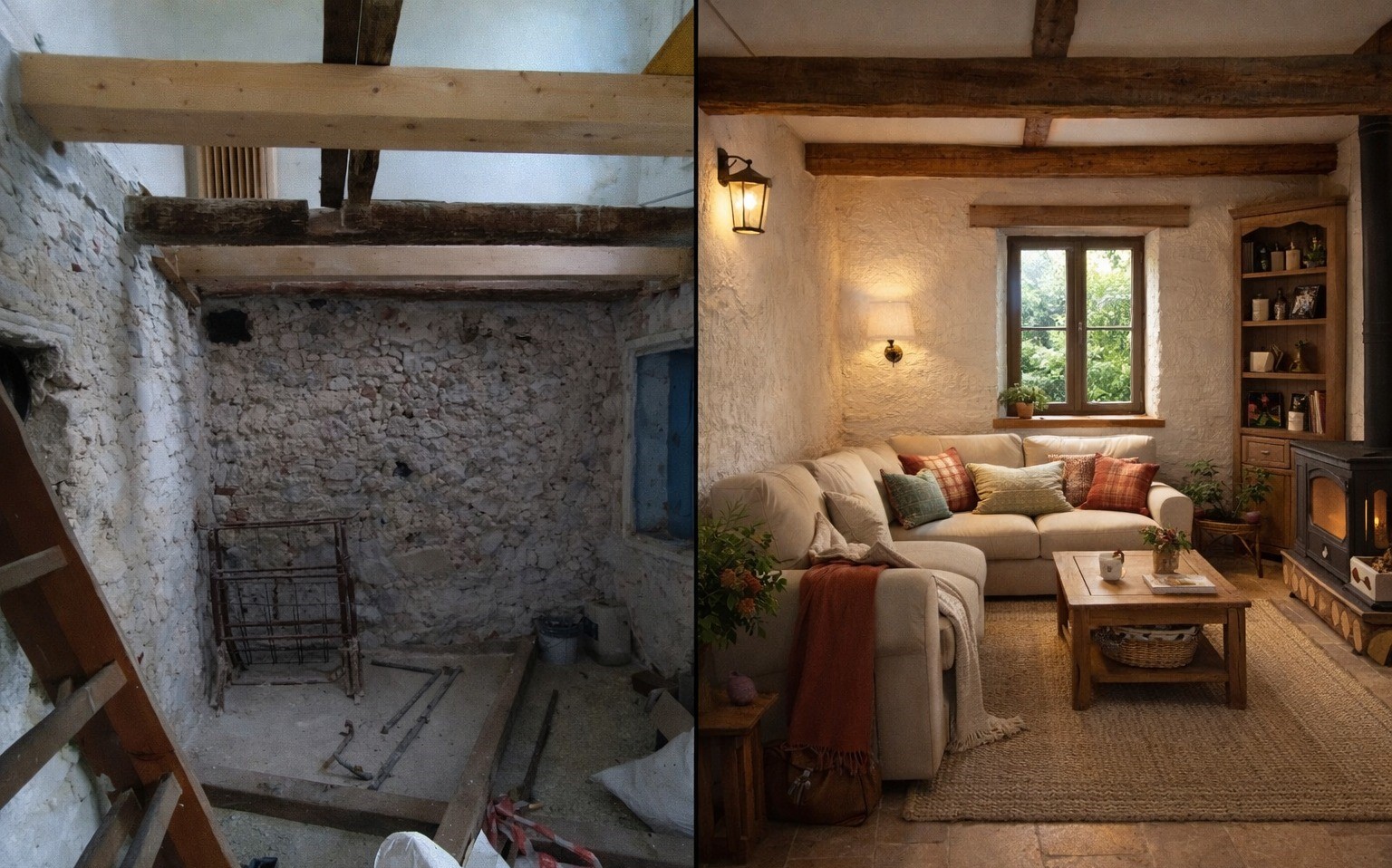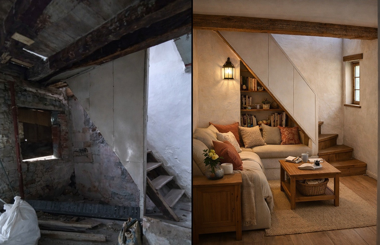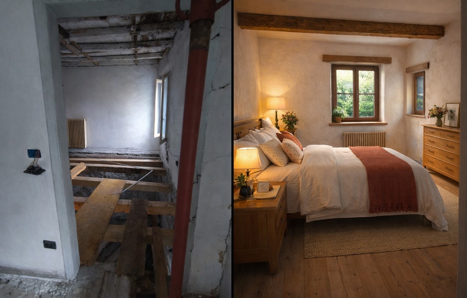 Nell’annuncio, sono presenti immagini illustrative/render progettuali che affiancano le foto dello stato attuale e mostrano come l’abitazione potrebbe diventare dopo una ristrutturazione, evidenziando il grande potenziale degli spazi: ambienti caldi e accoglienti, finiture in stile rustico-moderno, valorizzazione delle travi e della luce naturale.