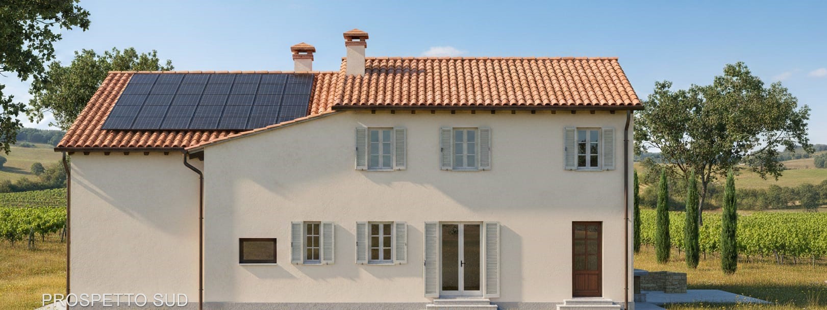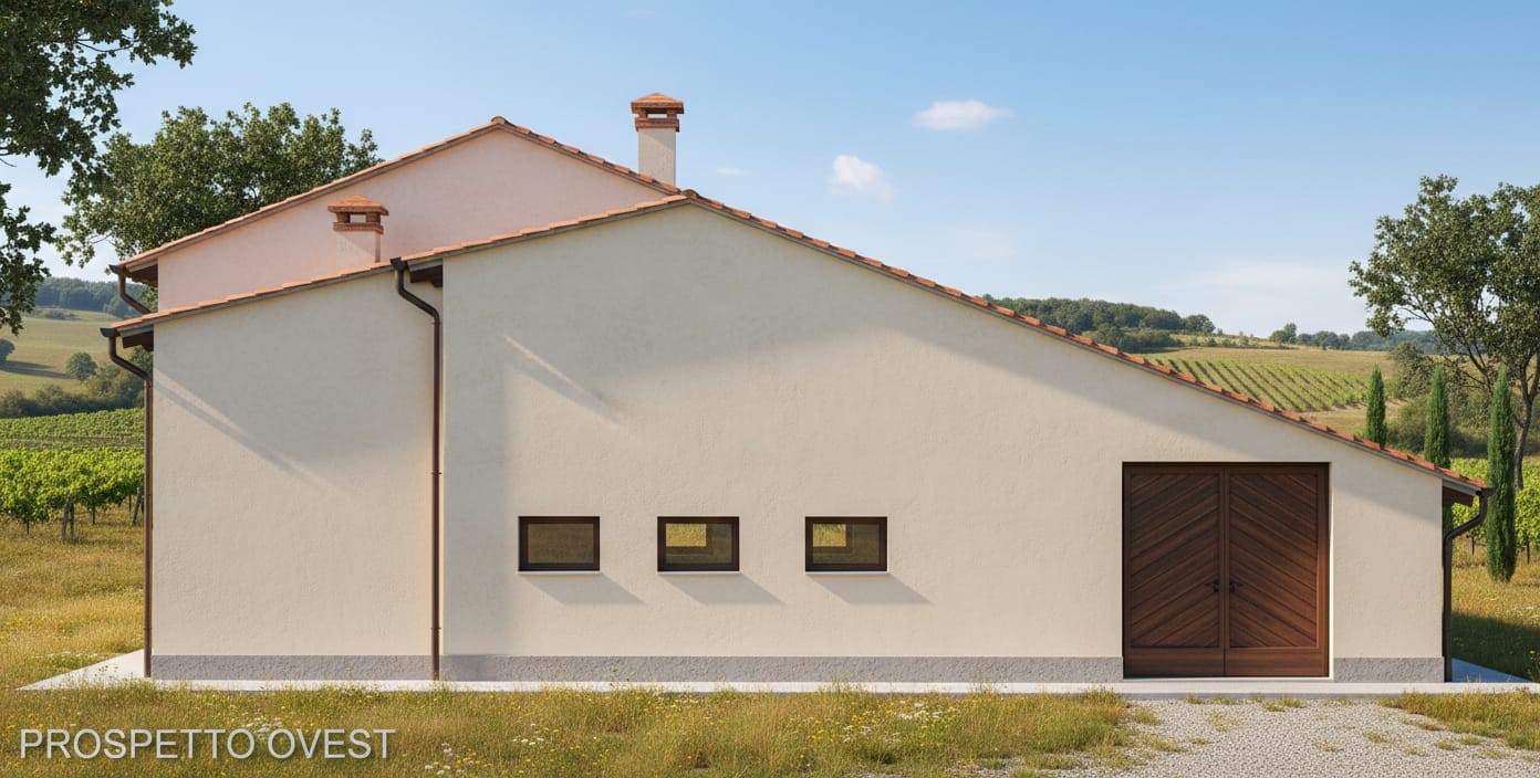 L’abitazione principale, esposta a Sud e sempre luminosa, si sviluppa su due livelli più sottotetto. Il progetto prevede: